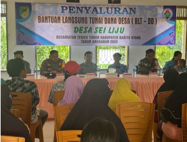 Barito Utara – 25 September 2025, Penyaluran Bantuan Langsung Tunai Dana Desa (BLT-DD) bagi warga miskin ekstrem Desa Sei Liju, Kecamatan Teweh Timur, Kabupaten Barito Utara, berjalan lancar pada Kamis (25/9/2025). Kegiatan yang dilaksanakan di Kantor Desa Sei Liju ini turut didampingi Bhabinkamtibmas Polsek Teweh Timur, Bripda Arya Caesar.