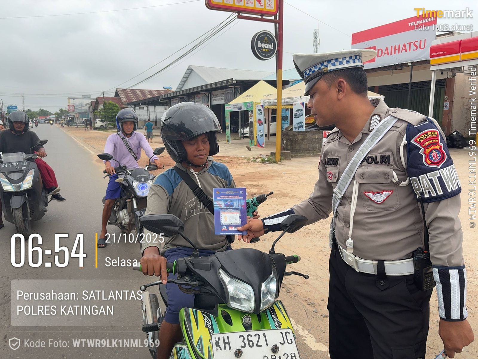 Polres Katingan – Salah satu cara Mewujudkan Kamseltibcarlantas Personil Satlantas Polres Katingan Membagikan Brosur Kepada Masyarakat Sembari Berikan Pesan Kamseltibcarlantas kepada pengguna jalan, Selasa (21/10/25).