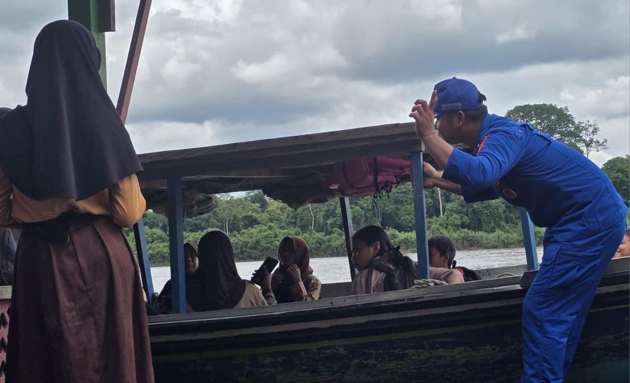 M Teweh- Personel Ditpolairud Polda Kalteng yang bertugas di DAS Barito melaksanakan kegiatan sambang ke motoris yang membawa anak sekolah untuk memberikan himbauan dan edukasi tentang pentingnya kelengkapan diatas kapal dan paham radikalisme anti Pancasila, Senin (27/10/2025).