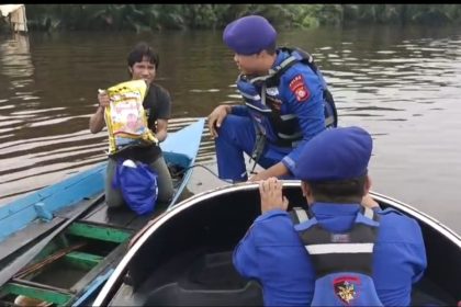 Kumai -Personel Ditpolairud Polda Kalimantan Tengah beserta Bayangkari yang bertugas di KP XVIII-2004 Das Kumai membagikan Bansos Kepada Masyarakat yang tinggal di Desa Sei Kapitan Kecamatan Kumai Kab...